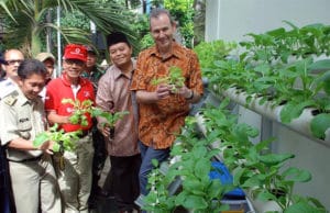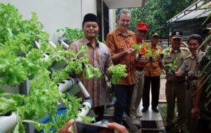 Wakil Ketua MPR RI Hidayat Nurwahid bersama David Nash perwakilan dari Zurich Foundation, Ketua Bidang Penanggulang Bencana, Sumarsono, perwakilan International Federation of Red Cross and Red Crescent Societies, IFRC saat melakukan pertemuan terkait penghijauan di wilayah Pengadegan, Jakarta Selatan, Selasa (30/1/2018). Disela pertemuan itu dilakukan peninjauan ke lokasi penghijauan tanaman Hidroponik yang sebelumnya telah dilakukan penanaman. Tanaman yang menggunakan hidroponik dapat di tanam menggunakan pot atau wadah dengan menggunakan air atau bahan lainnya berupa kerikil, pecahan genteng pasir, pecahan batu ambang dan lain sebagainya sebagai media penanaman.