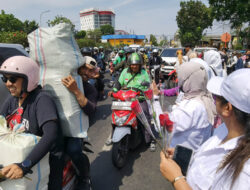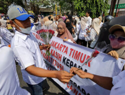 SUARAINDONEWS.COM, Jakarta – Aksi Aliansi Masyarakat Jakarta Timur membagikan bunga kepada pengendara yang melintas di kawasan Pasar Pramuka, Jakarta Timur, Selasa (17/10/2023) kemarin. Aksi bagi-bagi bunga ini dilakukan untuk mensyukuri atas dikabulkanya sebagian gugatan oleh Mahkamah Konstitusi (MK) dimana menyatakan batas usia capres-cawapres tetap 40 tahun kecuali sudah berpengalaman sebagai kepala daerah.
