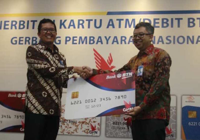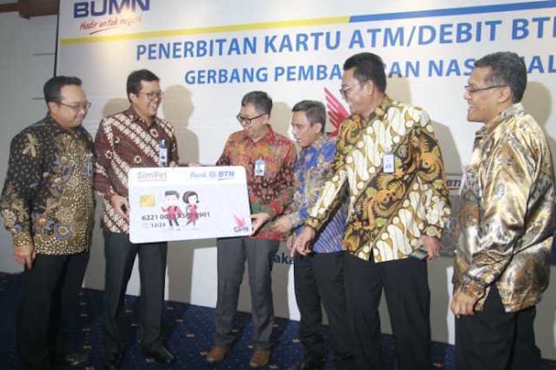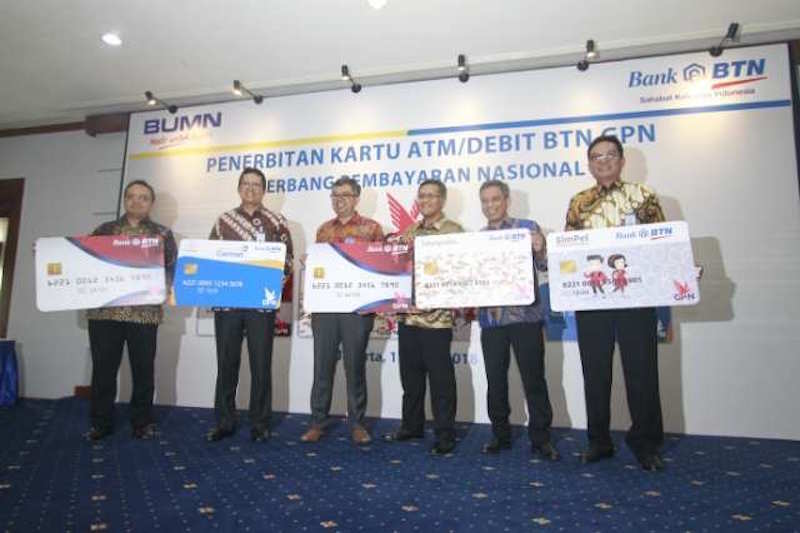 SUARAINDONEWS.COM, Jakarta-Direksi PT Bank Tabungan Negara (Persero) Tbk. Andi Nirwoto, R. Mahelan Prabantarikso, Nixon L. P. Napitupulu (ketiga kanan), Dasuki Amsir (kedua kanan), Kepala Grup Teknologi Finansial, Kerjasama & Komunikasi Sistem Pembayaran Bank Indonesia Erwin Haryono (ketiga kiri), dan Deputi Direktur Departemen Elektronifikasi & Gerbang Pembayaran Nasional Bank Indonesia (BI) A. Donanto H.W memamerkan mock-up kartu BTN GPN dalam penerbitan Kartu Debit Bank BTN Gerbang Pembayaran Nasional (GPN) di Jakarta, Selasa (17/4). Bank BTN menyiapkan 400.000 kartu debit berlambang Garuda untuk mendukung BI mengimplementasikan GPN dalam rangka mewujudkan interkoneksi dan interoperabilitas sistem pembayaran nasional. Untuk memperlancar transaksi Bank BTN juga menggandeng empat lembaga switching yaitu Jalin, Rintis, Artajasa, dan ALTO. Kartu debit berlogo GPN akan memberikan kemudahan dan keamanan bagi nasabah untuk bertransaksi di dalam negeri.
