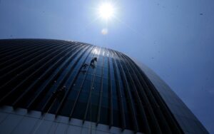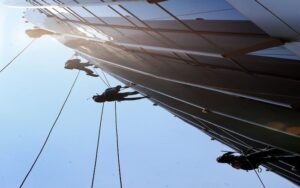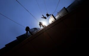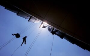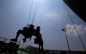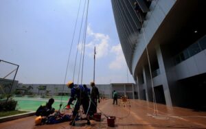 SUARAINDONEWS.COM, Jakarta-Pekerja mengevakuasi rekannya yang mengalami kram otot saat membersihkan dinding luar gedung Pelindo Tower di Jalan Yos Sudarso, Tanjung Priok, Jakarta Utara, Rabu (30/08/2023). Badan Penyelenggara Jaminan Sosial (BPJS) Kesehatan terus memperluas jangkauan untuk mengikutsertakan para pekerja rentan dalam programnya. Pekerja lepas dan pekerja informal bisa lebih tenang dalam berkegiatan setelah menggunakan Badan Penyelenggara Jaminan Sosial (BPJS) Kesehatan. Inisiatif perlindungan kepada para pekerja. ini merupakan terobosan untuk ikut serta berperan dalam memberikan layanan kesehatan prima di seluruh penjuru Indonesia. (Foto Astra Bonardo)
