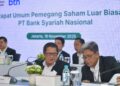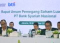 SUARAINDONEWS.COM, Jakarta – RUPSLB Bank Syariah Nasional (BSN) yang dipimpin oleh Komisaris Utama merangkap sebagai komisaris independent BSN Bahrullah Akbar didampingi oleh jajaran komisaris, Direktur Utama BSN Alex Sofjan Noor, Wakil Direktur Utama BSN Arga M. Nugraha beserta jajaran Direksi BSN lainnya menyetujui 4 mata acara yang menjadi agenda dalam RUPSLB, ya g diselenggarakan di Jakarta, Rabu (19/11). Setelah resmi menerima limpahan aset dan liability Unit Usaha Syariah (UUS) BTN, Bank Syariah Nasional (BSN) menyatakan kesiapannya untuk menjadi katalitas penguat pangsa pasar syariah di Indonesia. BSN pasca spin off beraset sekitar Rp71 Triliun juga siap mengejar pertumbuhan aset perseroan diatas Rp100 Triliun pada 2 tahun ke depan. Kesiapan BSN yang saat ini masuk dalam kelompok Bank Syariah dengan aset terbesar kedua di Indonesia juga disampaikan pada RUPSLB tersebut.