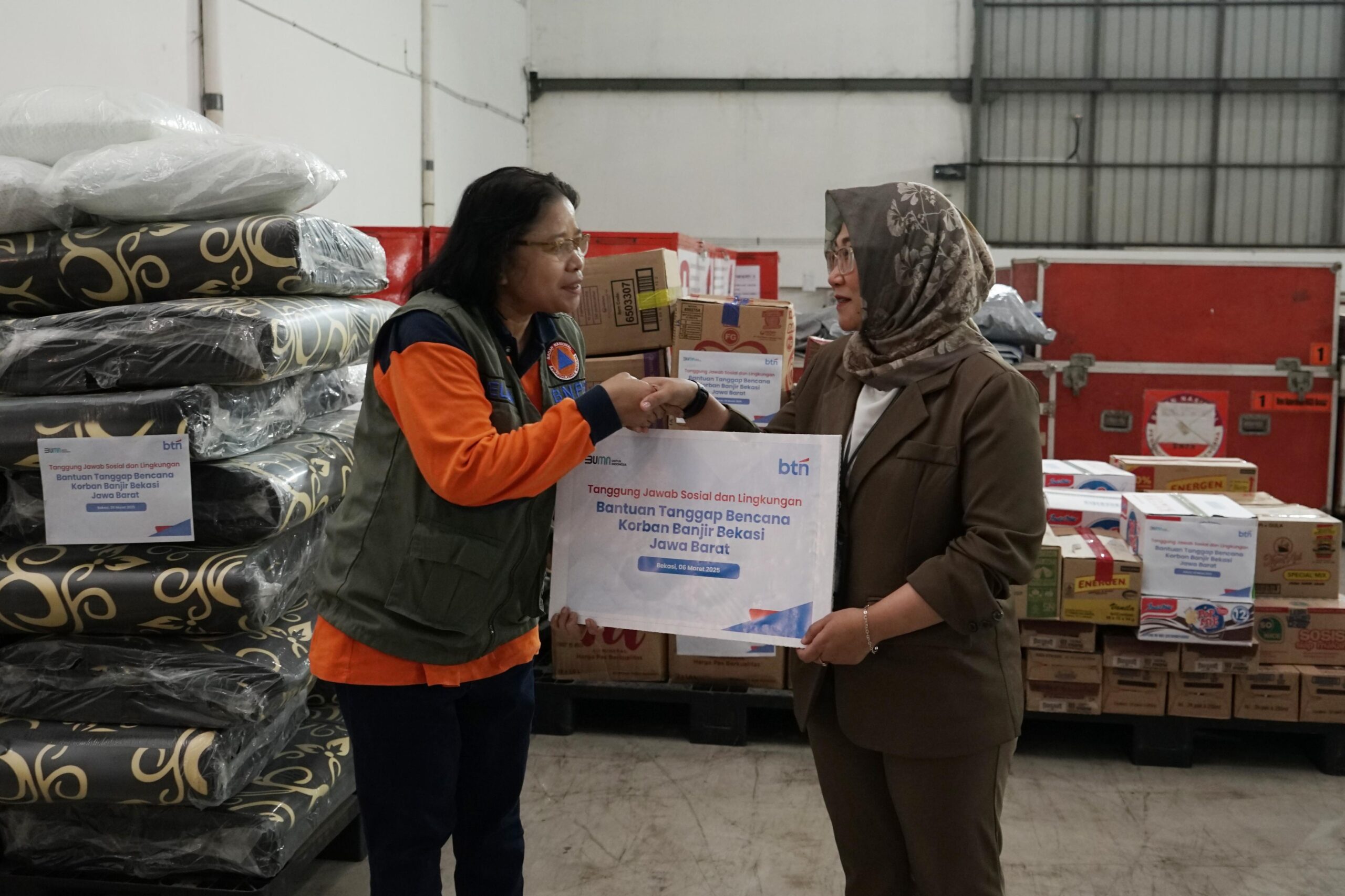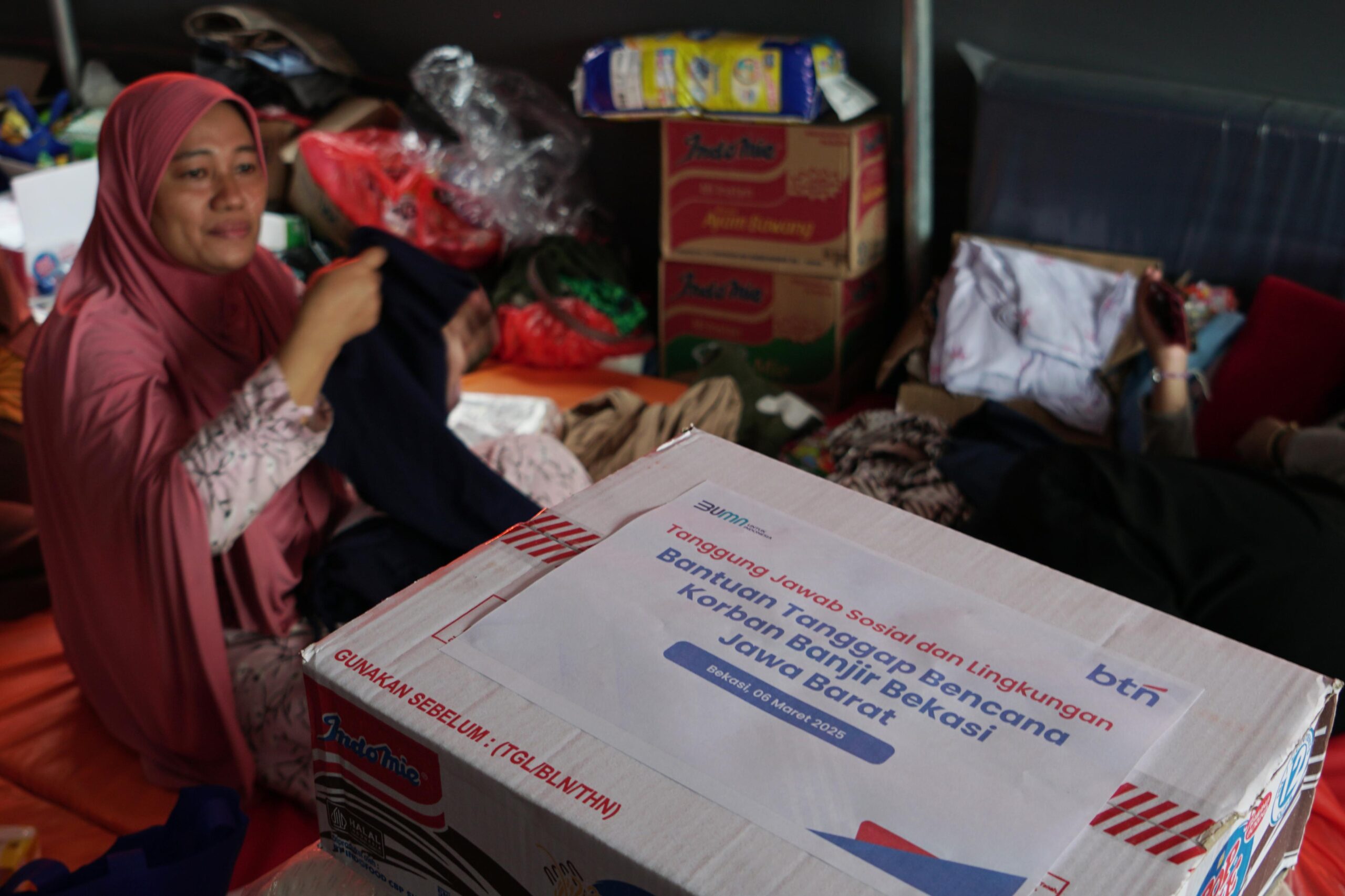 SUARAINDONEWS.COM, Jakarta – Branch Manager BTN Kantor Cabang Bekasi Shesharina Ayu Wulandini (kiri) menyerahkan bantuan Tanggung Jawab Sosial dan Lingkungan (TJSL) secara simbolis kepada korban banjir Bekasi di tenda pengungsian BNPB logistik di Jatirasa, Kota Bekasi, Jawa Barat, Kamis (6/3/2025). Bantuan yang diberikan BTN berupa kebutuhan orang dewasa dan anak-anak, makanan cepat saji, susu, air mineral, perlengkapan mandi, dapur, kasur, bantal dan selimut. Pemberian bantuan ini merupakan kepedulian BTN sebagai salah satu BUMN yang harus melaksanakan program TJSL guna mengurangi penderitaan masyarakat yang terdampak akibat bencana banjir tersebut.