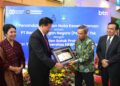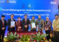 Simbolon memperlihatkan naskah MOU disaksikan Ompui Ephorus HKBP , Pdt. Dr. Victor Tinambunan, MST, Direktur Network & Retail Funding BTN Rully Setiawan, Direktur Commercial Banking BTN Hermita dan SEVP Digital Business BTN Thomas Wahyudi usai menandatangani Nota Kesepahaman (MOU) antara BTN dengan Huria Kristen Bataka Protestan (HKBP) dan Yayasan Universitas HKBP Nomensen di Medan, Sumater Utara, Selasa (26/8).