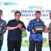 SUARAINDONEWS.COM, Jakarta – Ketua Satgas Perumahan Presiden terpilih Prabowo Subianto, Hashim S. Djojohadikusumo (tengah), Menteri BUMN Erick Thohir (kedua kiri) Direktur Utama PT Bank Tabungan Negara (Persero) Tbk Nixon LP Napitupulu (kedua kanan) menandatangani Prasasti Peresmian Rumah Rendah Emisi disaksikan Direktur Jenderal Pembiayaan Infrastruktur Kementerian PUPR Triono Junoasmono (kiri) dan Kepala Perwakilan Perserikatan Bangsa-Bangsa di Indonesia Gita Sabharwal (kanan), di acara Pilot Project Rumah Rendah Emisi di Perumahan Mutiara Gading City, Bekasi, Kamis (29/8).