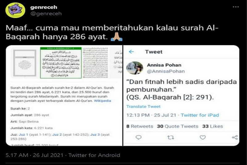 “Maaf… Cuma mau memberitahukan kalau surah Al-Baqarah hanya 286 ayat,” jelas akun @genreceh.