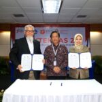 SUARAINDONEWS.COM, Jakarta-Direktur Water Resources, Sciences, and Process Technology Danone Indonesia Azwar Satrya Muhammad (kiri) bersama Kepala Pusyantek BRIN Dr. Yenni Bachtiar (tengah) melakukan penandatanganan peningkatan kerja sama untuk riset ilmiah pengukuran dampak penatalayanan air disaksikan Deputi Bidang Pemanfaatan Riset dan Inovasi BRIN DR. R. Hendrian, M.Sc pada acara Business Talk bertajuk “Kontribusi Talenta BRIN dalam Layanan Teknologi untuk Mendukung Pengembangan Bisnis, Peningkatan Daya Saing, dan Kemandirian Industri Nasional”, Selasa (08/08/2023) di Gedung B.J. Habibie, BRIN, Jakarta. Selasa (08/08/2023).