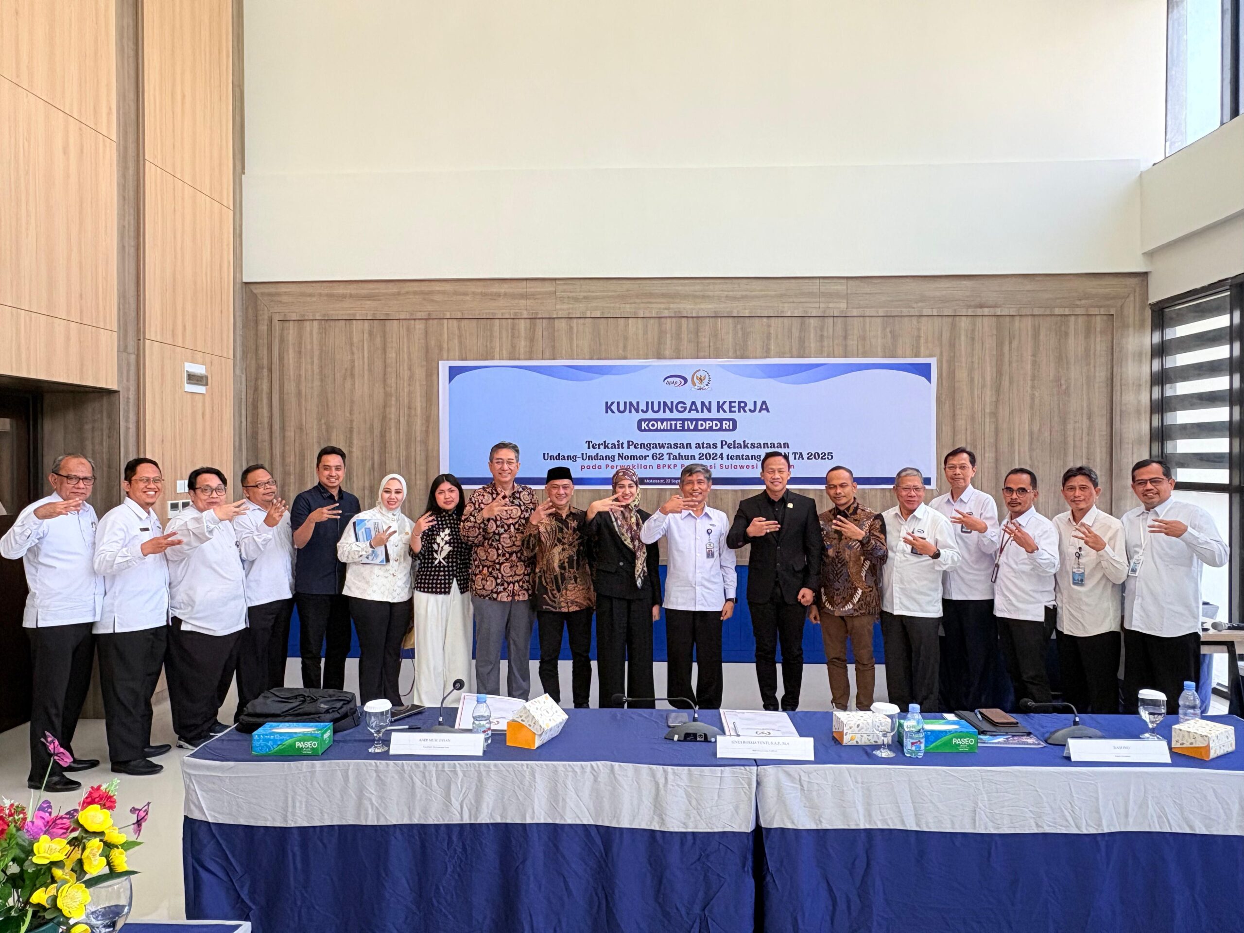 SUARAINDONEWS.COM, Makassar – Komite IV Dewan Perwakilan Daerah Republik Indonesia (DPD RI) melaksanakan kunjungan kerja ke Kantor Perwakilan BPKP Provinsi Sulawesi Selatan dalam rangka pengawasan atas pelaksanaan Undang-Undang Nomor 62 Tahun 2024 tentang APBN Tahun Anggaran 2025, dengan fokus pada efektivitas pengelolaan Dana Alokasi Khusus (DAK) dan Dana Alokasi Umum (DAU) di bidang pendidikan, kesehatan, dan infrastruktur.