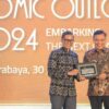 SUARAINDONEWS.COM, Surabaya – Direktur Utama Bank BTN Nixon LP Napitupulu memberikan cinderamata kepada Wakil Menteri Luar Negeri Republik Indonesia Pahala Nugraha Mansury pada acara BTN Prioritas Economic Outlook 2024 di Surabaya, Selasa (30/1). Dalam paparannya Pahala mengungkapkan walaupun ekonomi dunia diprediksi melambat, tetapi ada sejumlah sektor yang tumbuh positif di tahun ini, diantaranya adalah meningkatnya permintaan pengembangan energi baru terbarukan dan pengembangan industri manufaktur serta industri teknologi tinggi. Sektor potensial lainnya yaitu jasa keuangan, kesehatan, hospitality dan digital.