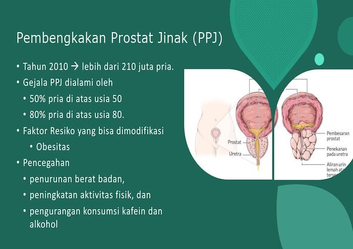 Sedangkan faktor yang dapat meningkatkan risiko kanker prostat yaitu usia yang semakin tua, sejarah keluarga, obesitas, diet dan gaya hidup dan mutasi genetik. (Aji).