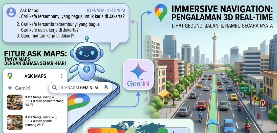Fitur Ask Maps memungkinkan pengguna mencari lokasi dengan cara yang lebih natural. Jika sebelumnya pencarian dilakukan dengan mengetik kata kunci, kini pengguna dapat mengajukan pertanyaan menggunakan bahasa sehari-hari seperti saat berbicara dengan teman.