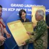SUARAINDONEWS.COM, Jakarta – Direktur Utama BTN Nixon LP Napitupulu disaksikan Direktur Distribution & Funding BTN Jasmin dan Kepala BTN Kantor Wilayah (Kanwil) 2 DKI-Banten Iriska Dewayani memberikan potongan tumpeng kepada nasabah BTN Rasyad Pandhega dalam acara Grand Launching BTN KCP Pasar Tanah Abang Blok A di Jakarta, Kamis (22/2).