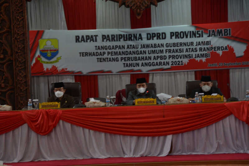 Setelah mendengarkan pemandangan umum Fraksi-Fraksi atas APBDP 2021, hari ini Gubernur Al Haris menyampaikan Jawaban Pemerintah atas penyampaian pemandangan umum Fraksi-Fraksi atas APBDP 2021. Dalam paripurna ini dihadiri Ketua, Wakil Ketua, Anggota DPRD Provinsi Jambi, Sekretaris Daerah dan OPD lingkup Pemerintah Provinsi Jambi.