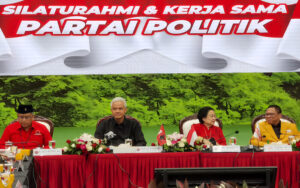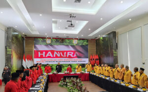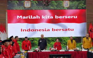 SUARAINDONEWS.COM, Jakarta-Ketua Umum PDI Perjuangan Megawati Soekarnoputri (tengah) bersama Ketua Umum Partai Hanura Oesman Sapta Odang (kedua kanan), Bacapres PDI Perjuangan Ganjar Pranowo (kedua kiri), Sekjen PDI Perjuangan Hasto Kristiyanto (kiri) dan Sekjen Partai Hanura Kodrat Shah (kanan) serta jajaran pengurus partai menyanyikan lagu Indonesia Raya saat silahturahmi di DPP PDIP, Jakarta, Senin (28/8/2023). Pertemuan tersebut dalam rangka silahturahmi dan kerja sama partai politik mendukung bakal calon presiden Ganjar Pranowo pada Pemilu 2024. (FOTO/ANTON)