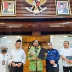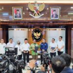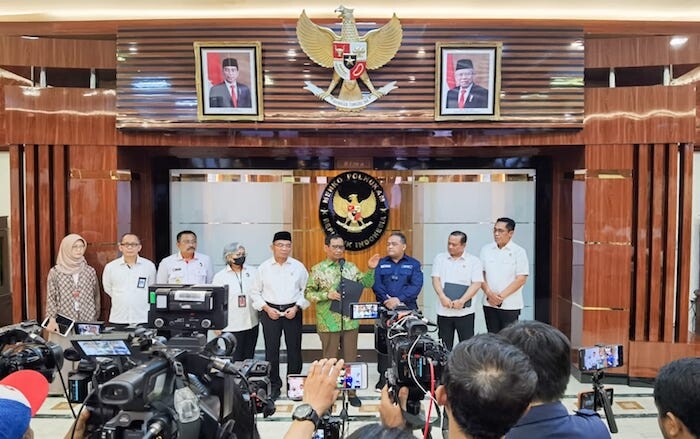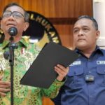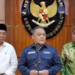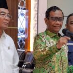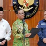 SUARAINDONEWS.COM, Jakarta-Menkopolhukam Mahfud MD (tengah) bersama Kepala BP2MI Benny Rhamdani (kanan) dan Menko PMK Muhadjir Effendy (kiri) memberikan keterangan kepada media terkait penanganan Tindak Pidana Perdagangan Orang (TPPO) di kantor Kemenko Polhukam, Jakarta, Selasa (4/7/2023).