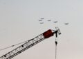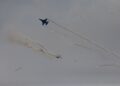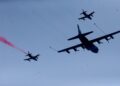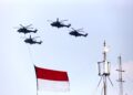 Sejumlah helikopter melintas di langit Monas membawa bendera raksasa bergambar lambang TNI serta tiga matra TNI — TNI AD, TNI AL, dan TNI AU — sebagai simbol kekuatan dan persatuan pertahanan negara. Tak kalah menarik, atraksi pesawat tempur juga memukau masyarakat yang memadati area sekitar Monas.