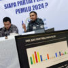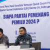 SUARAINDONEWS.COM, Jakarta – Peneliti senior LSI Denny JA, Adjie Alfaraby (kanan) didampingi moderator Farhan Dailamy memaparkan temuan dan analisis Survei Nasional bertajuk “Siapa Partai Pemenang Pemilu 2024?” di Jakarta, Kamis (15/2/2024).