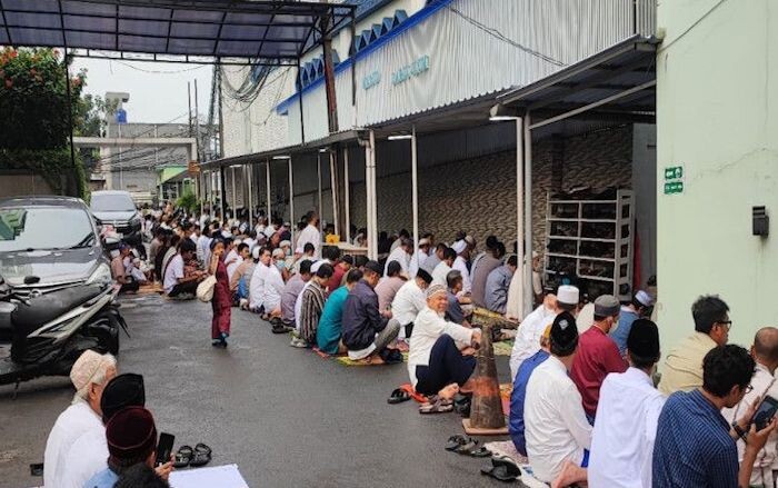 Bahkan masjid itu tak mampu menampung banyaknya jamaah yang ingin melaksanakan Shalat Id. Mereka terpaksa menggelar sajadahnya di pelataran masjid, di jalan hingga ke lahan parkir.