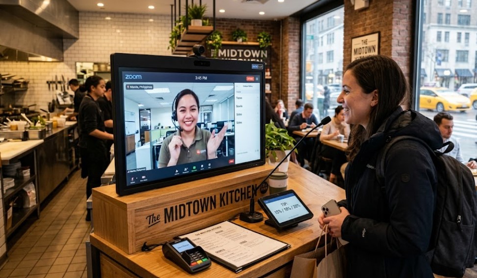 Jadi, pelanggan tetap datang ke restoran seperti biasa. Tapi pas pesan makanan, yang melayani muncul di layar. Kasirnya ada di Filipina, bukan di depan meja kasir.