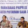 SUARAINDONEWS.COM, Jakarta – Peneliti senior LSI Denny JA, Adjie Alfaraby (kanan) didampingi moderator Fadhli Fakhri Fauzan memaparkan temuan dan analisis Survei Nasional bertajuk “Di Ambang Pilpres Satu Putaran Saja?” di Jakarta, Selasa (30/1/2024). Survei LSI terbaru akhir Januari 2024, elektabilitas Prabowo–Gibran berada di posisi teratas dengan elektabilitas sebesar 50.7%. Posisi kedua Anies-Muhaimin dengan elektabilitas 22.0%, sedangkan Ganjar-Mahfud dengan elektabilitas sebesar 19.7%. Dua minggu jelang pemilihan, jika berhasil mempertahankan tren yang di dapat, maka Prabowo-Gibran di ambang menang satu putaran saja.