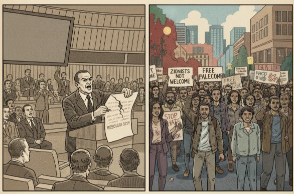 Lima dekade berselang, perdebatan antara anti-Zionisme dan antisemitisme kembali mencuat, terutama setelah eskalasi konflik pasca serangan Hamas pada 7 Oktober 2023. Di berbagai kota Barat — termasuk Melbourne, London, dan kampus-kampus Amerika — muncul slogan seperti “Zionists Not Welcome”.