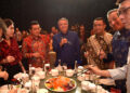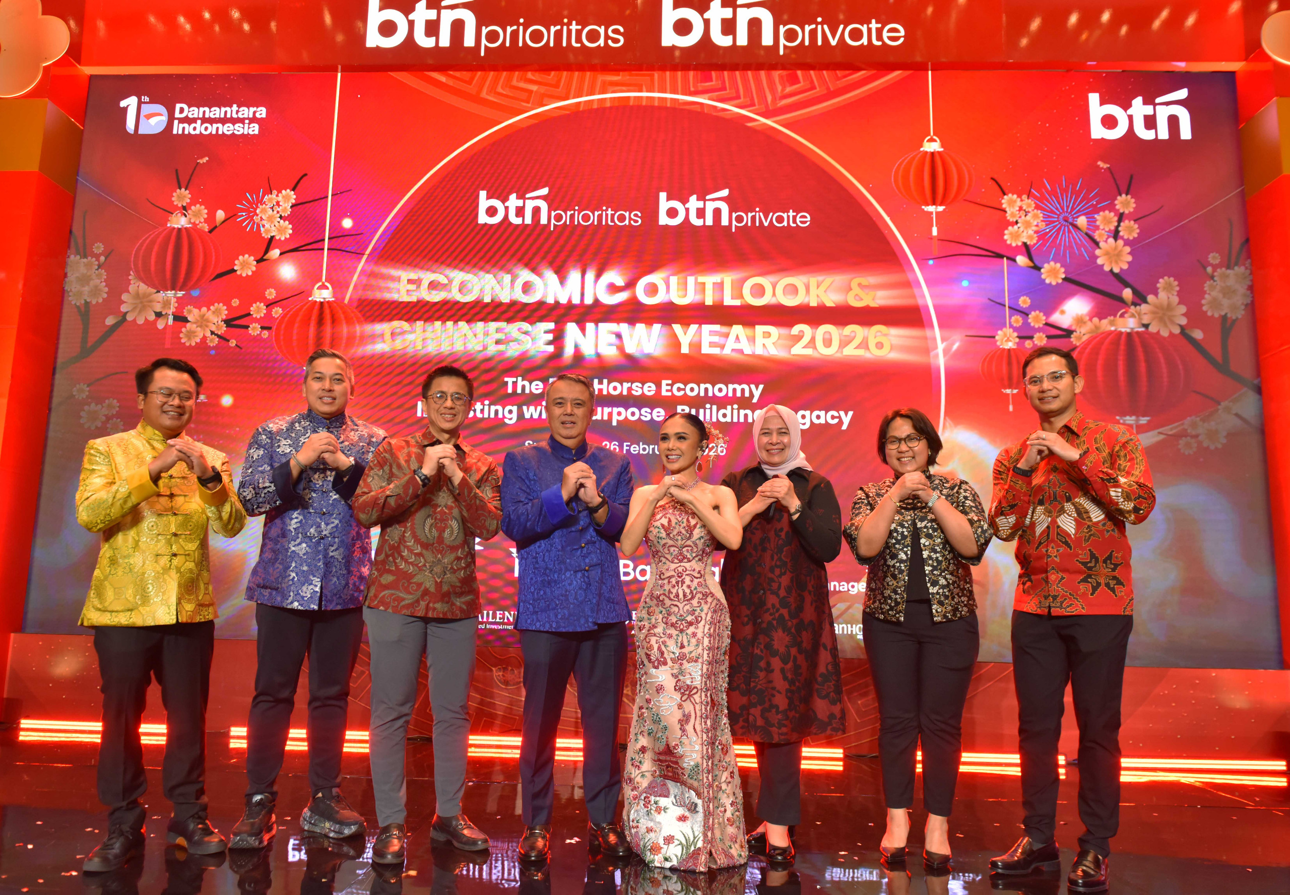 SUARAINDONEWS.COM, Surabya – Komisaris Independen PT Bank Tabungan Negara (Persero) Tbk Panangian Simanungkalit (ketiga kiri), Wakil Direktur Utama BTN Oni Febriarto Rahardjo (keempat kiri), dan Direktur Network and Retail Funding BTN Rully Setiawan (kedua kanan) kompak tersenyum bersama para nasabah sambil mengikuti tradisi Yusheng dalam kegiatan BTN Economic Outlook & Chinese New Year 2026 di Surabaya, Kamis (26/2).