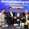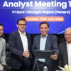 SUARAINDONEWS.COM, Jakarta – Direktur Utama PT Bank Tabungan Negara (Persero) Tbk Nixon LP Napitupulu (kedua kanan), Direktur Risk Management (kiri), Direktur Finance Nofry Rony Poetra (kedua kiri), dan Direktur Distribution and Institutional Funding Jasmin tersenyum sambil menunjuk laporan keuangan pada acara Analyst Meeting 1H24 di Menara BTN, Jakarta, Kamis (25/7). BTN mencatat penyaluran kredit dan pembiayaan mencapai sekitar Rp352,06 triliun sepanjang semester I/2024. Perolehan tersebut tumbuh 14,4% secara tahunan (yoy) dibandingkan periode yang sama pada tahun lalu sebesar Rp307,66 triliun.