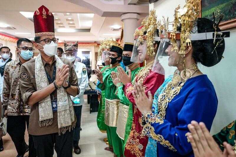 Menparekraf Sandiaga tiba di Bandar Udara Internasional Minangkabau, Rabu (21/4/2021) dan disambut Gubernur Sumatra Barat H. Mahyeldi Ansharullah, Wakil Gubernur Sumatra Barat Audy Joinaldy, Kepala Dinas Pariwisata Sumatra Barat Novrial, dan Sekretaris Dinas Pariwisata Sumatra Barat Taufik Ramadhan. Selanjutnya Menparekraf dan rombongan kemudian meninjau penerapan protokol kesehatan di bandara. Mulai dari pengambilan bagasi hingga deklarasi kesehatan E-HAC.