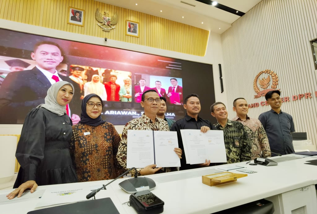 MoU ditandatangani oleh Ketua KWP Dr. Ariawan S.AP., MH.MA. dan Wakil Rektor Bidang Mutu dan Kerja Sama Universitas Paramadina Prof. Iin Mayasari, disaksikan jajaran Biro Pemberitaan DPR RI.