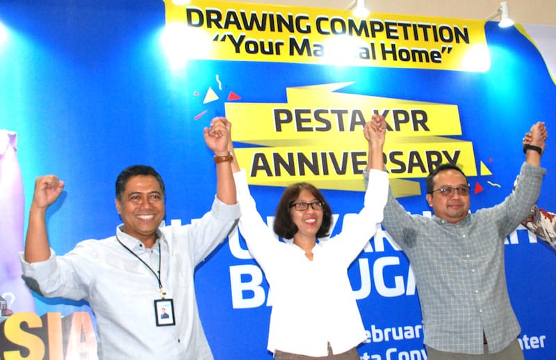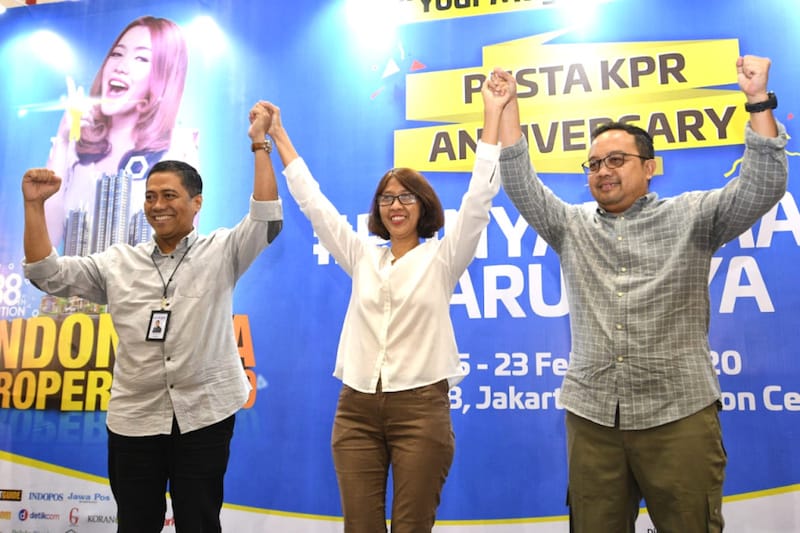 SUARAINDONEWS.COM, Jakarta-Jajaran Direksi PT Bank Tabungan Negara (Persero) Tbk Elisabeth Novie Riswanti diapit Andi Nirwoto dan Hirwandi Gafar mengangkat tangan usai menutup gelaran Indonesia Property Expo di Jakarta, Minggu (23/2).