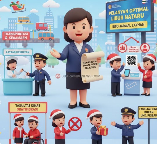 SUARAINDONEWS.COM, Jakarta – Untuk menjamin pelayanan tetap optimal, Menteri Pendayagunaan Aparatur Negara dan Reformasi Birokrasi (PANRB) Rini Widyantini mengimbau agar pelayanan kepada masyarakat selama libur Natal dan Tahun Baru (Nataru) tetap berjalan dengan berbagai penyesuaian yang diperlukan. Imbauan ini tertuang dalam Surat Edaran Menteri PANRB No. 8/2025 tentang Penyelenggaraan Pelayanan Publik Esensial pada Masa Libur Nasional dan Cuti Bersama.