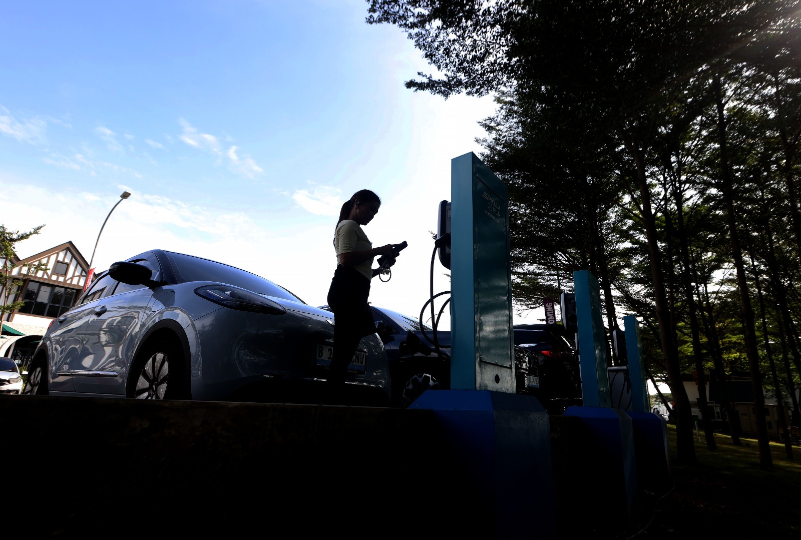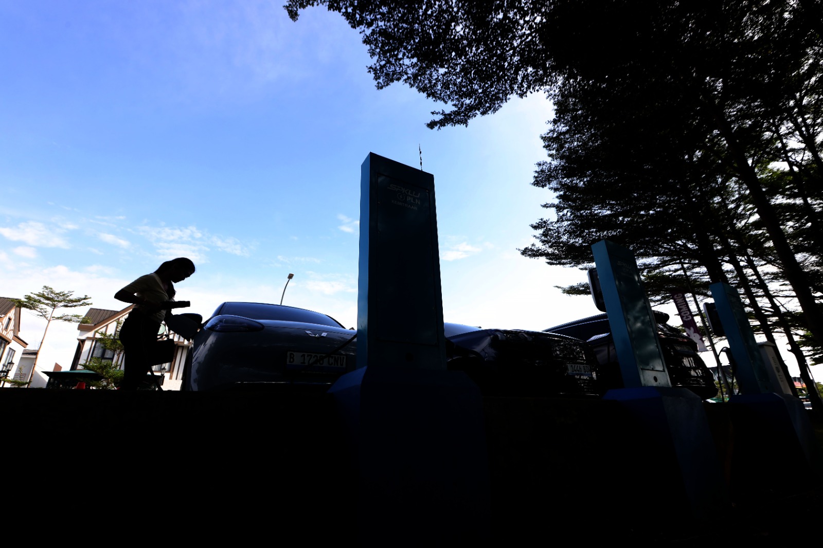 SUARAINDONEWS.COM, Jakarta – Pemilik kendraraan listrik melakukan pengisian ulang daya mobil listrik di Pengisian Bahan Bakar Listrik Umum (SPKLU) milik PT PLN (Persero) di kawasan terbuka hijau Waduk Citra 8 yang asri di Kalideres, Jakarta Barat, Rabu (22/10/2025).