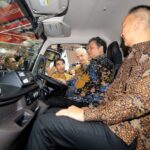 SUARAINDONEWS.COM, Jakarta-Menko Perekonomian Airlangga Hartarto (kedua kanan), Menteri Perindustrian Agus Gumiwang (kanan) mencoba kenyaanan trak eCanter disaksikan President Director PT. KTB (kiri) dan President and CEO MFTBC Karl Deppen (kedua kiri) pada pembukaan ajang pameran Gaikindo Indonesia International Auto Show 2023 di ICE BSD Tangerang, Kamis (10/08/2023).