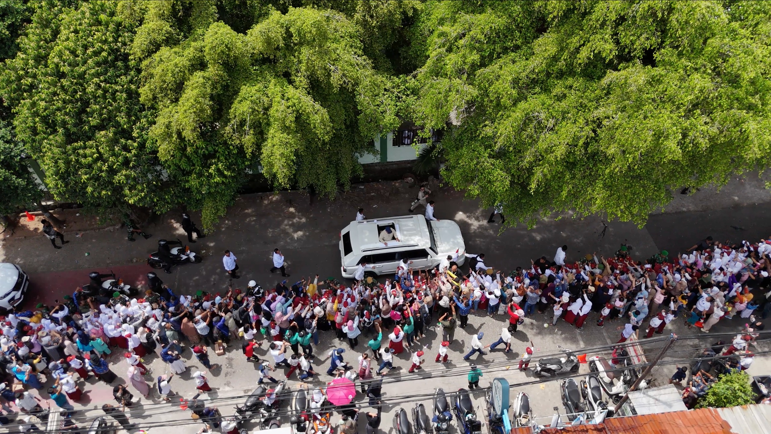 Sesampainya di depan gerbang SMPN 4 Kota Bekasi, sambutan untuk Prabowo semakin gemuruh. Para siswa dan guru tak sabar berjumpa secara langsung dengan orang nomor 1 di Indonesia itu.