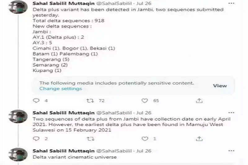 Sahal Sabilil Muttaqin menunggah foto update sekuens varian delta di Indonesia. Termasuk di antaranya varian Delta Plus yang telah ditemukan April lalu.