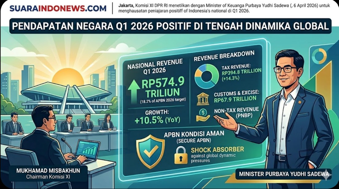 SUARAINDONEWS.COM, Jakarta — Komisi XI DPR RI menggelar rapat kerja bersama Menteri Keuangan Purbaya Yudhi Sadewa di Kompleks Parlemen, Senayan, Jakarta, Senin (6/4/2026). Rapat tersebut membahas kinerja penerimaan negara pada Triwulan I Tahun Anggaran (TA) 2026 yang menunjukkan capaian positif di tengah dinamika ekonomi global.