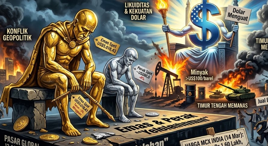 Fenomena ini juga terlihat di berbagai pasar global. Di India misalnya, harga emas dan perak mengalami tekanan jual tajam sepanjang minggu. Setelah penutupan perdagangan 14 Maret, kontrak emas MCX turun hingga berada di bawah Rs 1,60 lakh per 10 gram, sementara perak MCX juga melemah sekitar 1%. Harga emas spot global bahkan sempat turun lebih dari 1% dan berjuang mempertahankan level psikologis US$5.050 per ons. Sementara itu, perak spot juga ikut terseret, anjlok sekitar 4% ke kisaran US$80,5 per ons.