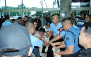 Petugas Pengamanan Dalam (Pamdal) DPR RI berusaha merebut spanduk dan mengamankan tujuh orang Mahasiswa yang tergabung dalam Garda Alam Pikir Indonesia (GAPI), saat melakukan aksi unjukrasa di lobby Gedung Nusantara III, Kompleks Parlemen Senayan, Jakarta, Kamis (18/1/2018). Mahasiswa tersebut mendesak Ketua DPR RIBambang Soesatyo, untuk mundur dari jabatan Ketua DPR yang baru bekerja selama tiga hari sejak dilantik dalam sidang Paripurna.