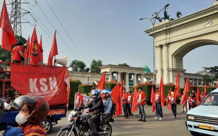 Selanjutnya, ribuan buruh itu menuju ke Jakarta untuk bergabung dengan pekerja lain yang menggelar aksi demonstrasi di Istana Negara dan Patung Kuda, Jakarta Pusat.