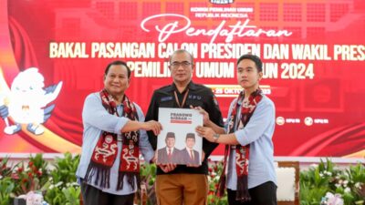 Prabowo Subianto (Prabowo) dan Gibran Rakabuming Raka (Gibran) resmi mendaftar septa mendeklarasikan diri sebagai calon presiden dan calon wakil presiden ke KPU. Prabowo-Gibran menjadi pasangan ketiga yang mendaftar ke KPU.