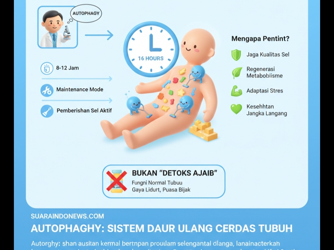 SUARAINDONEWS. COM, Jakarta – Dalam beberapa tahun terakhir, istilah autophagy semakin dikenal masyarakat seiring meningkatnya minat terhadap pola hidup sehat dan praktik puasa. Secara ilmiah, autophagy merupakan proses biologis alami di mana sel tubuh membersihkan, memperbaiki, dan mendaur ulang komponen yang sudah rusak atau tidak lagi berfungsi optimal.