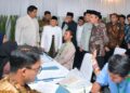 SUARAINDONEWS.COM, Jakarta – Direktur Utama BTN Nixon LP Napitupulu (kanan) bersama Menteri Perumahan dan Kawasan Permukiman Maruarar Sirait (kiri), dan Ketua Dewan Pertimbangan Majelis Ulama Indonesia Ma’ruf Amin (kedua kiri), dan Wakil Ketua Umum MUI Marsudi Syuhud (kedua kanan) meninjau Akad Massal KPR Subsidi berskema syariah di Asrama Haji Pondok Gede, Jakarta, Sabtu (26/7). Program hasil kolaborasi tersebut ditujukan bagi Da’i, Guru Ngaji, Aktivis Islam, dan Pegawai Ormas Islam di lingkungan MUI sebagai bagian dari upaya menghadirkan hunian yang layak, terjangkau, dan sesuai prinsip syariah. Adapun pada tahun ini, Pemerintahan Presiden Prabowo Subianto melalui Kementerian PKP mengalokasikan penyaluran 5.000 unit rumah subsidi bagi pekerja di lingkungan MUI melalui pembiayaan pemilikan rumah BTN Syariah.