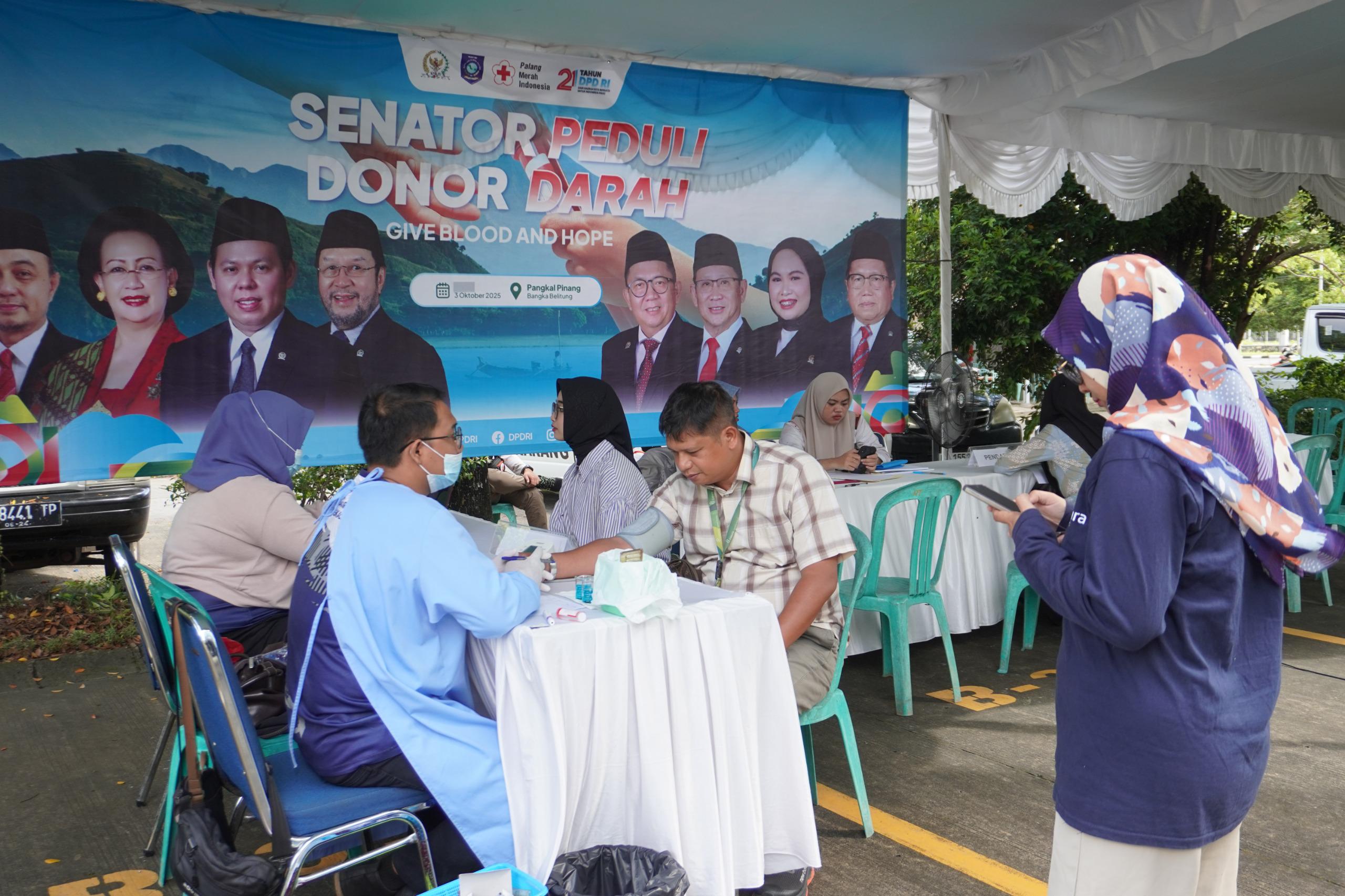 SUARAINDONEWS.COM, Pangkalpinang – Memperingati Hari Ulang Tahun (HUT) ke-21, Dewan Perwakilan Daerah Republik Indonesia (DPD RI) menggelar kegiatan sosial bertajuk “Senator Peduli Donor Darah” di Kantor DPD RI Provinsi Kepulauan Bangka Belitung (Babel), Jum’at (3/10). Kegiatan ini menjadi wujud kepedulian senator terhadap kebutuhan darah khususnya bagi masyarakat Babel. Acara dibuka secara resmi oleh empat Senator asal Babel, yakni Zuhri M. Syazali, Bahar Buasan, Dinda Rembulan dan Darmansyah Husein. Lebih dari 66 peserta mengikuti donor darah, terdiri dari jajaran internal DPD RI, masyarakat umum, hingga relawan.