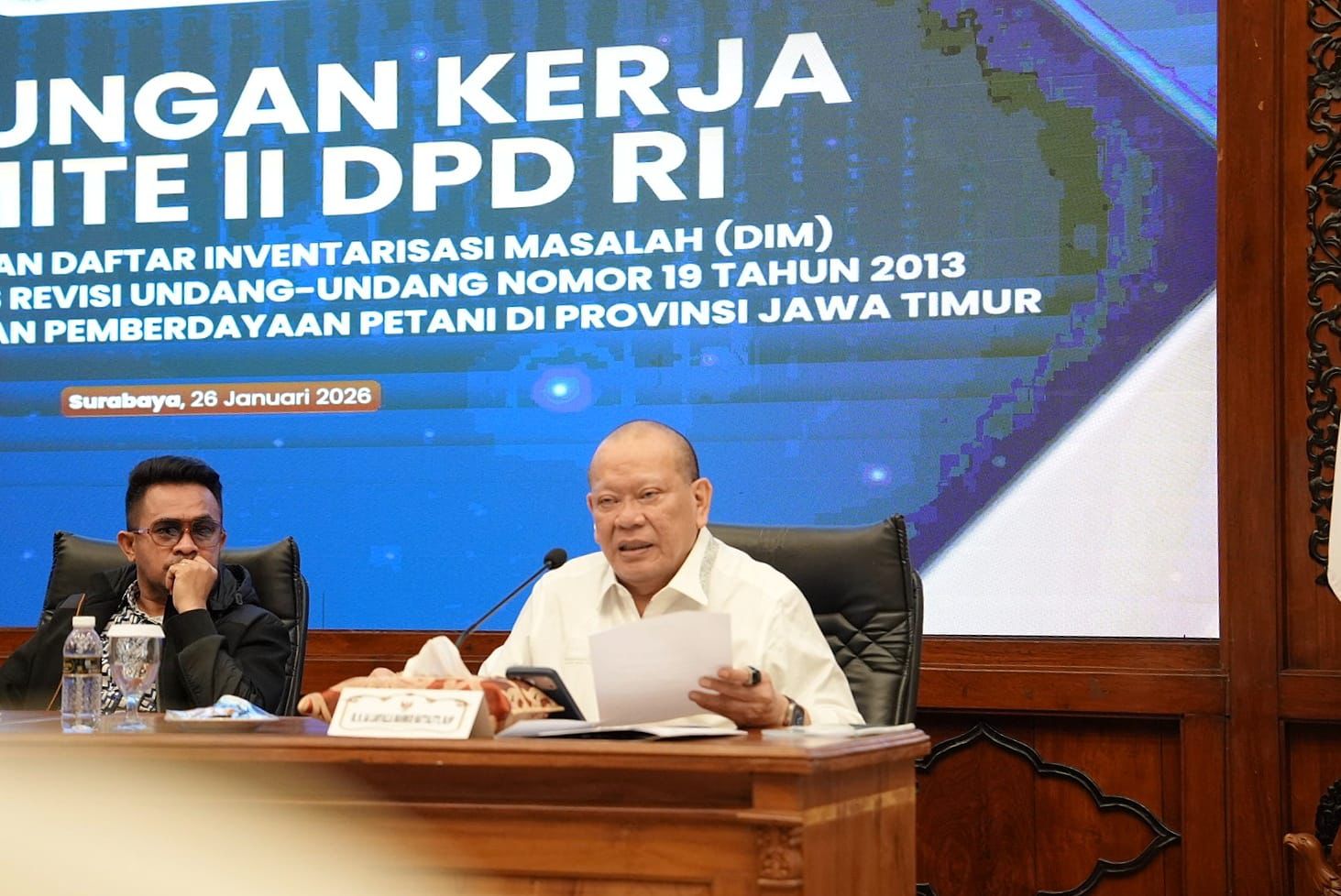 Dalam kunjungan kerja Komite II yang dipimpin oleh Ketua Komite II, Badikenita Br. Sitepu (Anggota DPD RI asal Sumatera Utara) itu, rombongan Anggota Komite II diterima oleh Sekretaris Daerah Pemerintah Provinsi Jawa Timur Adhy Karyono, Senin (26/1/2026). Hadir pula dalam pertemuan yang berlangsung di ruang rapat Binaloka Adhikara, perwakilan dari Kementerian ATR/BPN, Kementerian Lingkungan Hidup, dan Kementerian Pertanian, serta Serikat Petani Indonesia.