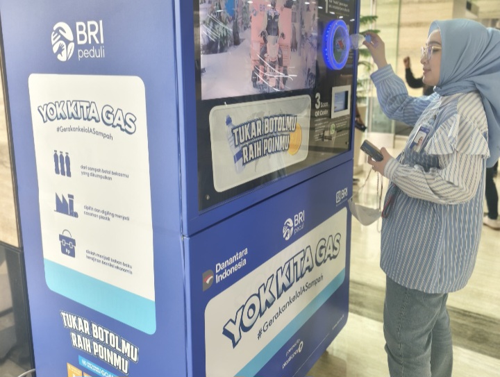Mesin daur ulang BRI, yang dikenal sebagai Reverse Vending Machine (RVM) melalui program BRI Peduli – Yok Kita Gas merupakan mesin pintar untuk menukarkan botol plastik bekas menjadi saldo e-wallet (Plastikpay).